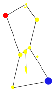 This features a unique and intricate design of a constellation, which is an astronomical pattern formed by the apparent positions of stars in the sky. This particular constellation has a distinctive shape with multiple yellow and red dots scattered throughout its structure. The dots are arranged in various sizes and shapes, creating a visually appealing and captivating representation of the celestial body.
