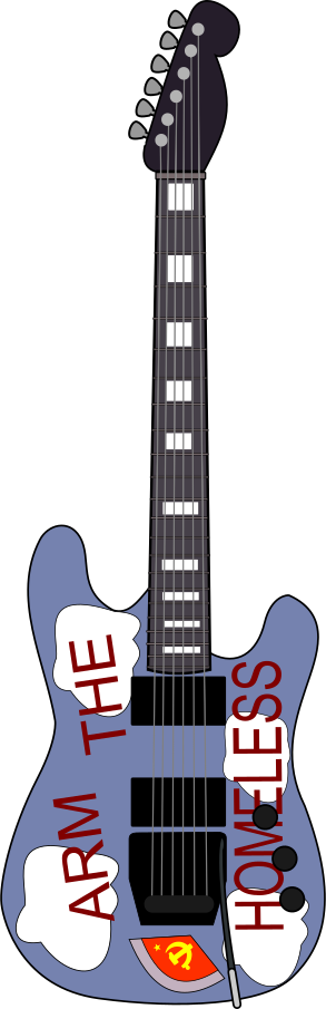 This features a guitar with the words "arm the homeless" written on it. This unique design is likely related to a cause or message that supports those in need. The guitar itself appears to be blue and has an orange logo, adding a touch of color to its overall appearance.