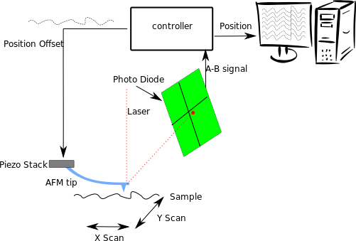 This depicts a diagram of an AFM (Atomic Force Microscopy) setup. It shows the process of taking a sample and scanning it with the help of a laser. The diagram includes several components such as position, controller, and position offsets. There are also arrows pointing to different parts of the setup, indicating their functions in the overall process. The image is accompanied by text explaining each component and its role in the AFM system. For instance, the "position" refers to the location where the sample is placed on a stage, while the "controller" manages the movement of the stage. The "position offsets" are adjustments made to ensure accurate positioning of the sample during scanning. Overall, this diagram provides an insight into the intricate workings of an AFM system and its various components.