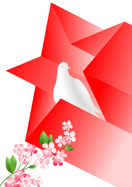 This features a white dove sitting inside a red star, which is adorned with pink flowers. The dove appears to be the focal point of the design, as it sits prominently within the star. The red star itself has a three-dimensional appearance, giving it an interesting and eye-catching quality. The combination of the white dove and the red star creates a visually appealing and unique design that is representative of Soviet culture or artistic expression.