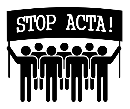 This features a group of people standing together, holding up a sign that reads "Stop ACTA!". They are all dressed in black and appear to be silhouettes. The sign is positioned above the crowd, with each person's figure overlapping one another. This protest-like scene seems to convey a sense of unity among the individuals as they stand together against the Anti-Counterfeiting Trade Agreement (ACTA).