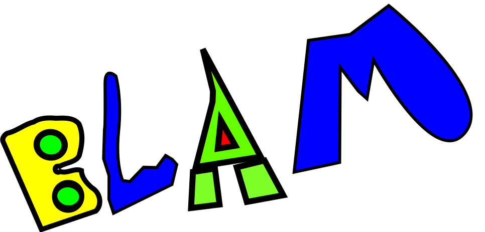 This features a large blue letter "M" with various colors and shapes surrounding it. The letter is made up of smaller letters, including the word "BLAM," which is written in different colors and placed around the main letter. This creative arrangement gives the impression that the letter is being formed by these smaller pieces. The overall effect is a visually engaging and playful representation of the letter M.