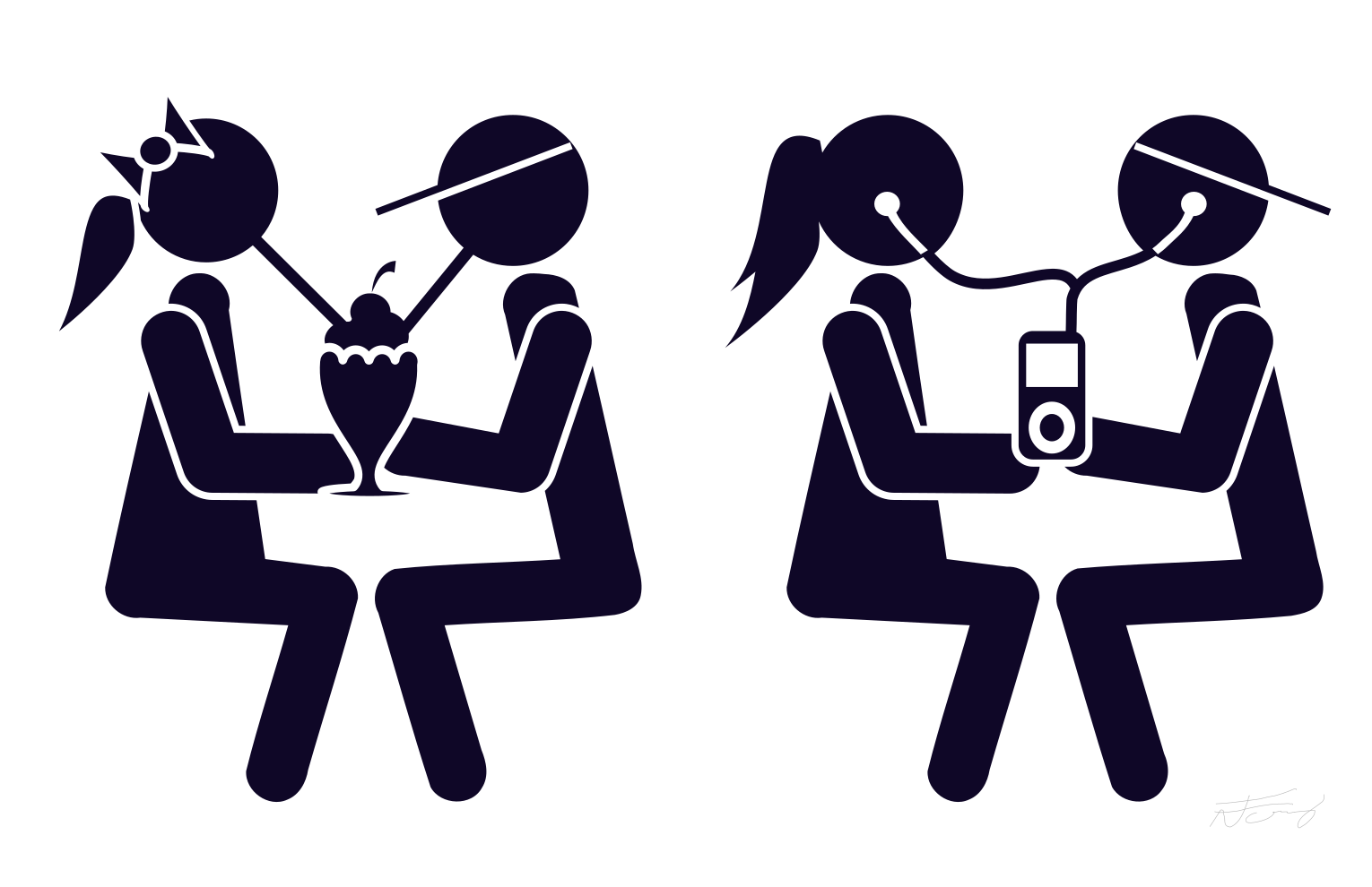 This features a black and white illustration of two couples sitting next to each other. In the scene, one couple is enjoying an ice cream sundae together while the other couple has an iPod in the middle of them, with both individuals wearing earbuds. This unique combination of activities suggests that they are sharing a moment of relaxation and bonding over their shared interests in music or technology. The illustration captures the essence of modern social interactions where people can connect through various forms of entertainment and communication.