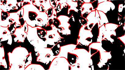 This features a large group of dogs with their mouths open, all positioned in various orientations. They are arranged in a pattern that fills the entire frame, creating an eye-catching and dynamic scene. The dogs appear to be staring at something or someone off-camera, adding a sense of curiosity and interest to the image. This unique composition showcases the dogs' expressions and creates a visually engaging piece of artwork.