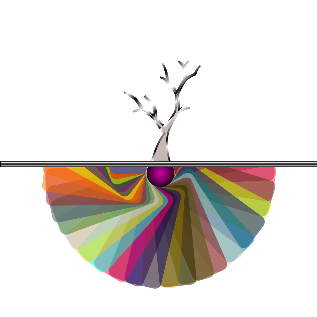 This features a tree with no leaves, sitting on top of a colorful earth. The tree is brown in color and appears to be made of metal or plastic. Below the tree, there is an intricate design that resembles a rainbow, adding a vibrant touch to the scene. This unique combination of elements creates a visually appealing image that captures the viewer's attention.