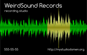 This features a business card for Weird Sound Records, which is a recording studio. The card has a green and yellow background with a black border around the edges. In the center of the card, there is an illustration of sound waves, giving it a unique appearance. The card also includes contact information, including a phone number (510-689-6363) and a website address ([www.mystudiodom.org](http://www.mystudiodom.org)). This business card is designed to attract potential clients and showcase the recording studio's services.