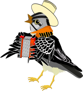 This features a bird with a white hat and a red beak, standing on one leg. It is holding an accordion in its claws, giving it the appearance of a musician. The bird's outfit adds a whimsical touch to the scene. In addition to the main bird, there are two smaller birds visible in the background, one near the top left corner and another towards the bottom right side of the image.