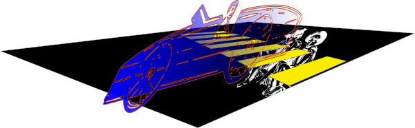 This features a blue car with yellow wheels, which is positioned above two people. One person appears to be sitting in the driver's seat of the car, while the other person is standing next to it. The scene seems to depict an accident or a dangerous situation involving the vehicle and the individuals present. The image has been described as a graphic, suggesting that it may have been created using digital art tools or techniques.