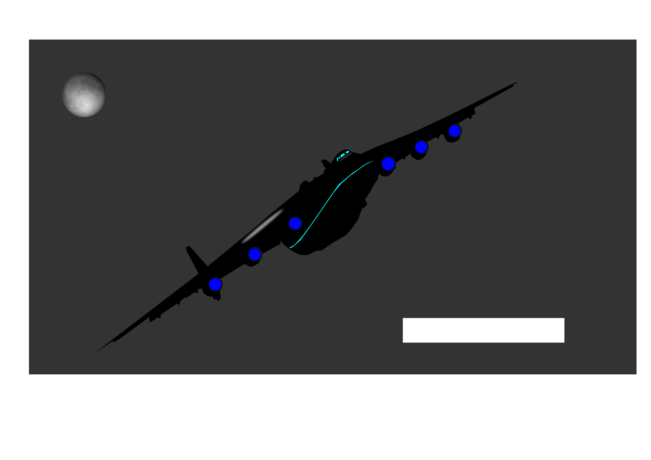 This features a large airplane with blue lights on its wings, flying through the night sky. The plane is positioned in the center of the scene and appears to be heading towards the moon, which can be seen in the upper left corner of the image. The airplane's lights are illuminating the dark sky, creating a striking contrast against the black background. This captivating scene showcases the beauty of both aviation and celestial wonders.
