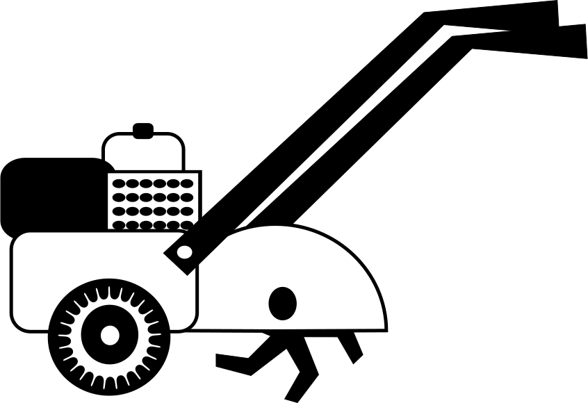 This features a black and white illustration of a man running away from an oversized rototiller. The rototiller is positioned behind the man, almost as if it's chasing him. The scene appears to be a playful representation of a person trying to escape from a large piece of machinery. The illustration captures the sense of urgency and fear that the man might feel in this situation.