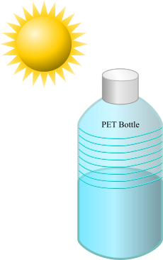 This features a clear bottle with the word "PET" written on it. It is filled with water and placed in direct sunlight, which indicates that it is being used for solar water disinfection (SODIS). This process involves exposing water to sunlight to kill harmful bacteria and make it safe for consumption. The bottle's placement under the bright sunlight highlights its role in this natural purification method.