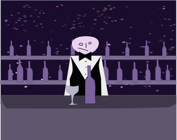 This features a bartender standing behind the bar, wearing a black vest and bow tie. He appears to be looking at something with an expression of displeasure or annoyance. There are several wine bottles on display in front of him, arranged neatly on shelves. A wine glass is also visible on the counter, adding to the ambiance of the bar scene. The overall atmosphere suggests a nighttime setting, possibly at a fancy restaurant or bar with an elegant decoration style.
