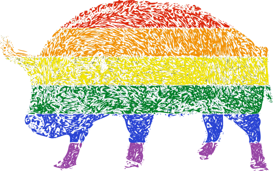 This features a large, colorful pig with rainbow colors on its body. It appears to be walking across the ground and is surrounded by a vibrant background that adds to the overall visual appeal of the scene. The pig's unique appearance suggests it might be an artistic representation or a symbol for something important. The use of rainbow colors in the image could signify inclusivity, diversity, or acceptance, as these colors are often associated with LGBTQ+ pride and support. Overall, the image captures a visually striking scene that may hold deeper meaning or significance to those who view it.