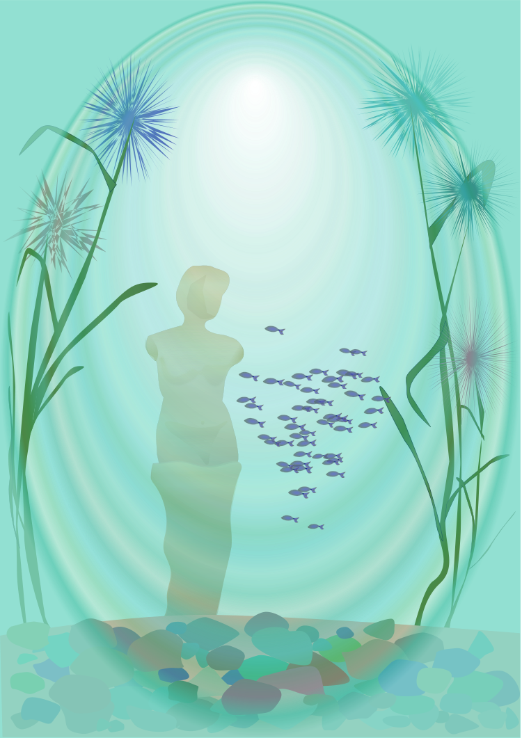 This features a beautifully crafted statue of a woman, standing in an underwater environment. She is surrounded by a multitude of fish swimming around her, creating a serene and peaceful atmosphere. The scene appears to be set in a pond or aquarium, with the water providing a natural habitat for the fish. The combination of the statue's graceful pose and the vibrant colors of the fish creates an enchanting visual experience that captures the viewer's attention.