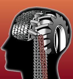 This features a close-up of the human head, with an interesting twist. Inside the brain, there are pictures of gray tires and chains, creating a unique visual effect. This artistic representation of the inner workings of the mind adds a creative touch to the otherwise ordinary subject matter. The background of the picture is orange at the top and reddish orange at the bottom, which further enhances the overall composition of the image.