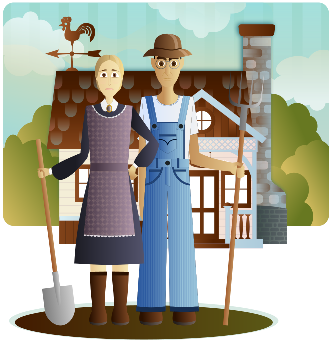 This features a man and woman standing in front of a house, both holding shovels. They appear to be posing for the camera with smiles on their faces. The woman is wearing an apron, while the man has a hat on his head. In addition to the couple, there are two chickens visible in the scene, one near the top left corner and another towards the bottom right side of the image. A potted plant can also be seen placed close to the house, adding some greenery to the scene.