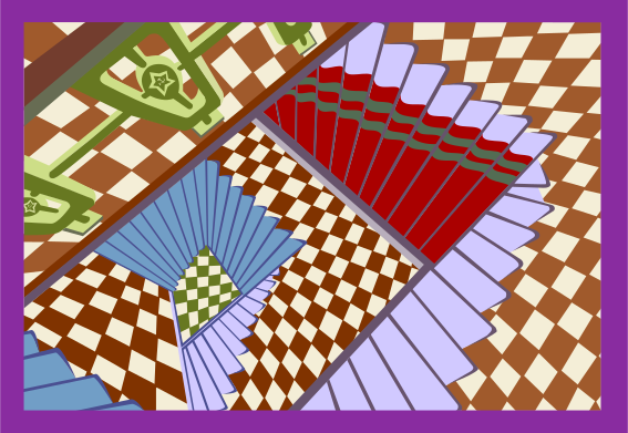 This features a spiral staircase with a checkered pattern on the steps. The stairs are made of wood and have a unique design, giving them an artistic appearance. There are several sets of stairs in the scene, each varying in size and position. Some of these stairs are located closer to the foreground while others extend further into the background. The overall effect is that of a visually appealing and intricate structure.
