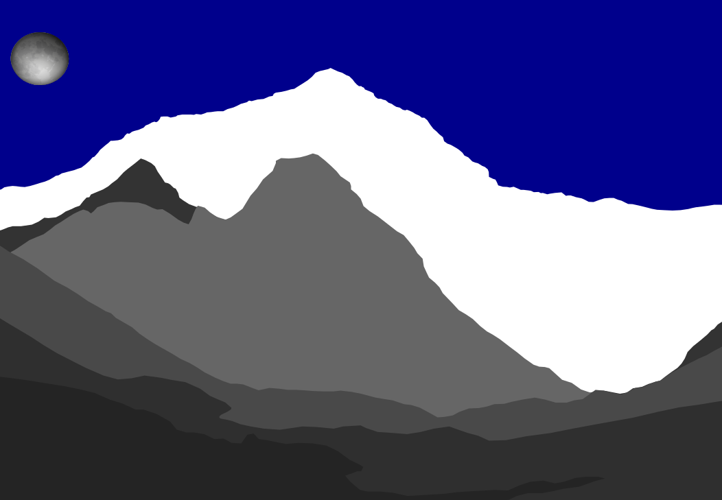 This features a majestic mountain with snow-capped peaks, towering over the surrounding landscape. The mountain is situated in front of a large body of water, creating an impressive contrast between the natural elements. In the background, there are trees that add to the beauty and tranquility of the scene. Above this picturesque setting, a moon can be seen, adding a touch of serenity to the overall atmosphere. The combination of the mountain, water, and moon creates an idyllic and captivating image.