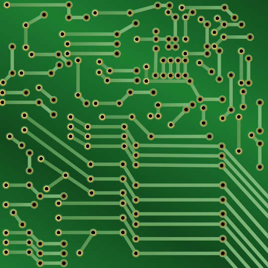 This features a close-up of an electronic board with numerous small yellow circles connected by bright green lines. These yellow circles are likely components or connections within the circuitry, while the green lines represent the pathways for electrical signals to flow through. The board is dark green in color and appears to be densely packed with these tiny components. This image showcases a detailed view of an electronic device's internal structure, highlighting its intricate design and functioning.