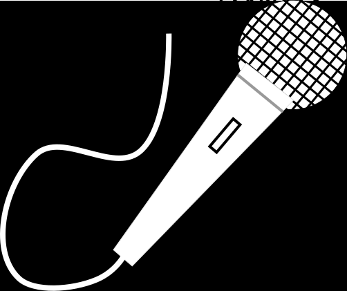 This features a black background with a white microphone prominently displayed. The microphone is positioned towards the center of the frame, and it appears to be an illustration or drawing rather than a real-life object. The simplicity of the scene allows the focus to remain on the microphone itself, making it the main subject of the image.