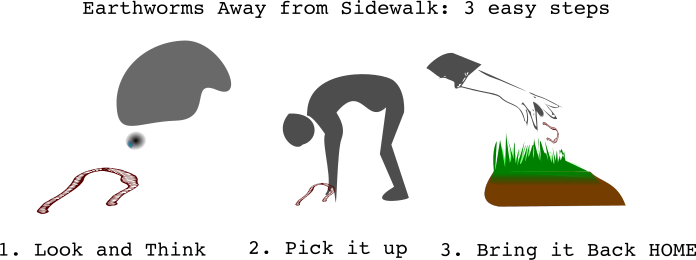 This is a cartoon illustration of three steps to save earthworms from being squished by a sidewalk. The first step is to look and think, which involves observing the area where the worms are likely to be found and considering how to avoid stepping on them. The second step is to pick it up, which means carefully lifting the worm off the ground without causing harm or injury to oneself. Finally, the third step is to bring it back home, which involves releasing the earthworm in a safe environment where it can continue its life without being harmed by vehicles or other hazards. The illustration also includes a caption that reads "3 easy steps: look and think, pick it up, bring it back home."