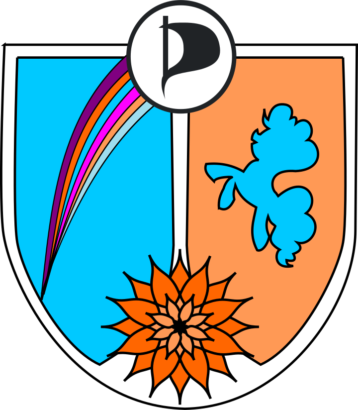 This features a colorful coat of arms with various colors and designs. In the center, there is an orange horse with blue wings, which appears to be the main focus of the design. Surrounding this central figure are different colored shapes and patterns that create a visually appealing composition. The overall effect gives off a pirate-like vibe, making it an interesting and unique piece of artwork.