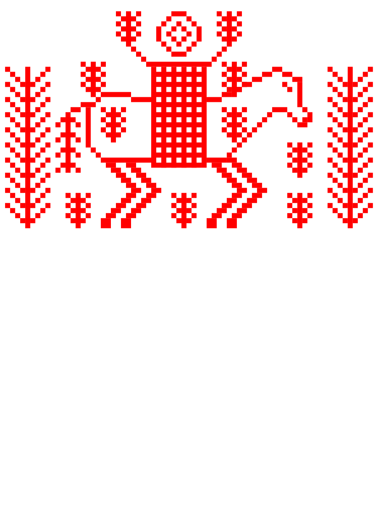 This features a patterned design with a horse as the central figure. The horse is depicted in various positions, including standing and riding on top of another horse. The design also includes other elements such as leaves and dots scattered throughout the pattern. This intricate pattern appears to be part of an embroidered piece or textile decoration, possibly from Belarus. The overall composition showcases a unique and artistic representation of the horse and its surroundings.