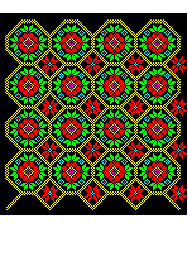 This features a beautifully designed pattern of red and green flowers, which are arranged in a hexagonal shape. There are twelve distinct hexagons visible in the design, each containing different shades of red and green. These hexagons are placed on top of one another to create an intricate and visually appealing pattern. The overall effect is that of a colorful and vibrant textile decoration, likely originating from Litvinsky, Belarus.