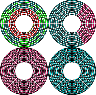 This features a set of four circles, each with different colors and patterns. These circles are arranged in a square formation, creating an interesting visual effect. Each circle has a unique design, making the overall composition visually appealing. The colors used for these circles include red, green, blue, and yellow, adding variety to the image. The combination of these vibrant colors and intricate patterns creates a captivating scene that can be appreciated by viewers.