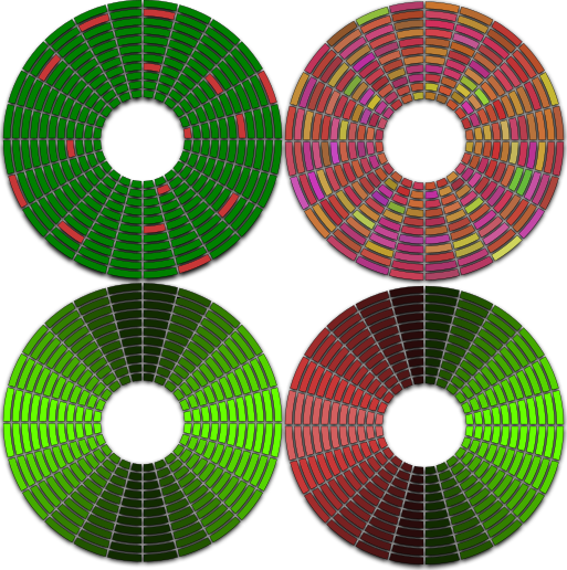 This features four different colored circles, each with a unique design. These circles are placed on top of one another, creating an interesting visual effect. The colors include green, red, yellow, and brown, adding variety to the overall composition. Each circle appears to be made up of smaller circles or segments, further enhancing the complexity of the image. Overall, it is a visually engaging piece that showcases the creativity behind these colorful designs.