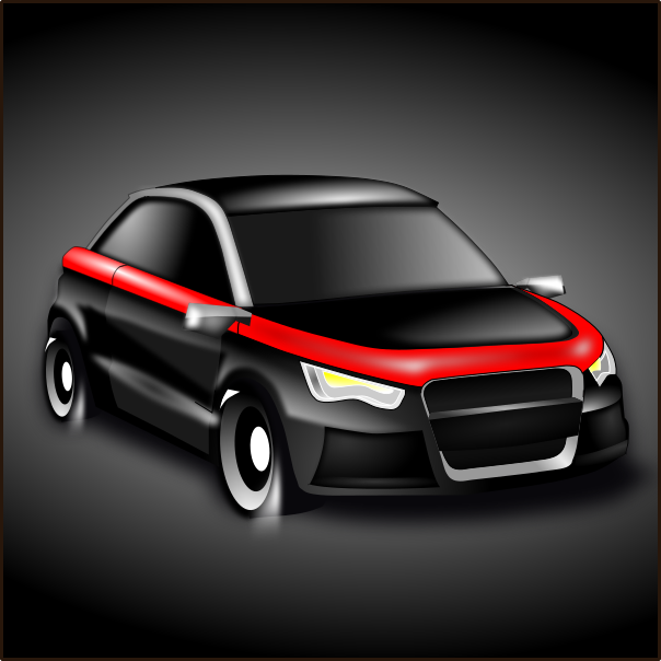 This features a black and red Audi car parked on the side of the road. The car is positioned in front of a dark background, which adds to its striking appearance. The car's color scheme consists of a black body with red accents, giving it an eye-catching look. The car appears to be well-maintained and ready for use on the road.