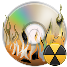 This features a CD with flames surrounding it, giving the appearance of being on fire. In addition to the flames, there is also an exclamation point symbol in the center of the disk. This unique design gives the impression that the CD may be radioactive or potentially dangerous.