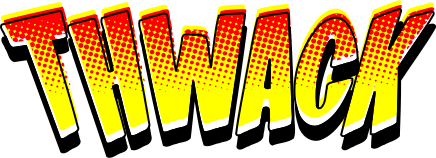 This features a comic book style lettering of the word "Twack" with a yellow background. The letters are arranged in a way that gives an impression of a sound effect, possibly from a comic book or a superhero's power. The design is reminiscent of vintage comic books and adds a sense of nostalgia to the image.