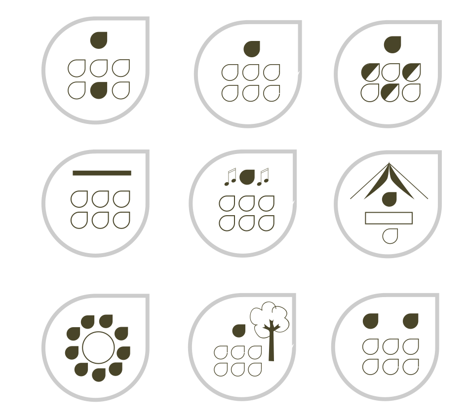 This features a collection of nine icons, each with a teardrop shape and light grey outline. These icons represent various activities or symbols, such as music notes, a tent, a tree, and a house. Each icon is placed within its own circle, creating an organized and visually appealing presentation. This collection of icons could be used for a variety of purposes, including educational materials, presentations, or even as decorative elements in a design project.