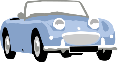 This features a blue sports car with a white top, driving down the road. It appears to be an old model, possibly a vintage vehicle. The car is positioned in the center of the scene and seems to be the main focus of the illustration. The drawing style gives it a cartoon-like appearance, making it visually appealing and interesting for viewers.
