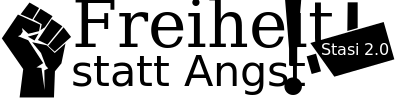 This features a black and white background with the words "Freiheit statt Angst!" written in German. This translates to "Freedom not fear!". In the middle of the scene, there is an image of a clenched fist, which symbolizes strength and solidarity. On the right side of the image, there is a CCTV camera with the label "Stasi 2.0", referring to the Stasi, a former East German secret police organization. The combination of these elements creates an atmosphere of resistance against oppressive forces and a call for freedom and human rights.