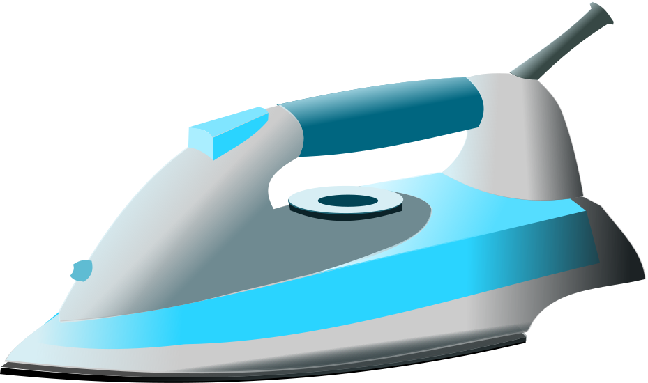 This features a blue and gray iron on its side, with the handle facing left. This illustration is likely used for educational purposes or as an example of a household appliance. The iron's design appears to be modern and sleek, making it suitable for various settings. Its positioning in the image suggests that it may be placed on a countertop or other flat surface, ready for use by someone who needs to press their clothes. Overall, this illustration effectively captures the essence of an iron and its purpose within a home setting.