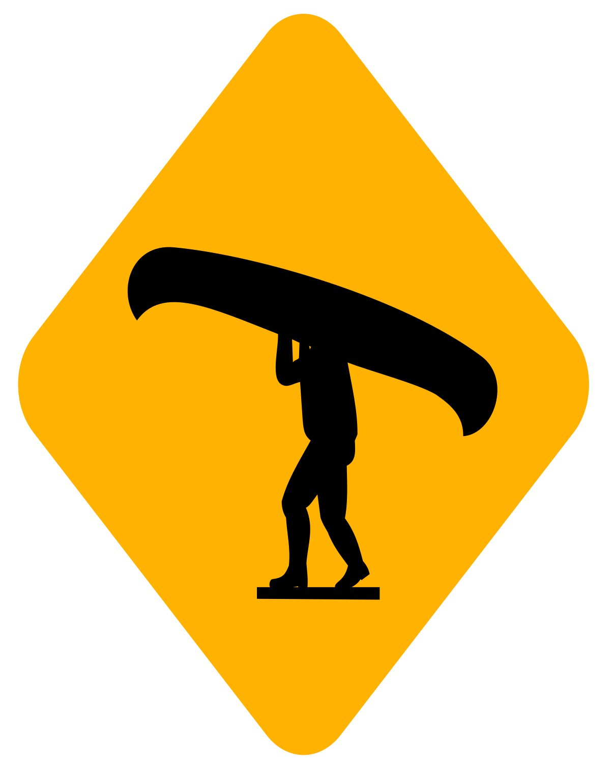 This features a yellow diamond-shaped sign with an illustration of a man carrying a canoe. The man is depicted in the center of the sign, holding the canoe above his head as he walks. This unique design serves to convey the message that portage is allowed or required in this area. The sign's bright yellow color and distinctive shape make it easily noticeable for those passing by.