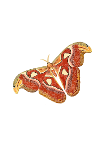 This features a beautifully drawn illustration of an atlas moth, which is a type of butterfly. This particular species has a striking appearance with its large wings and intricate patterns. The drawing captures the essence of this unique creature, showcasing its distinctive features such as the orange wings and the yellow markings on them. The illustration is presented in black and white, which adds to the elegance and timelessness of the image.
