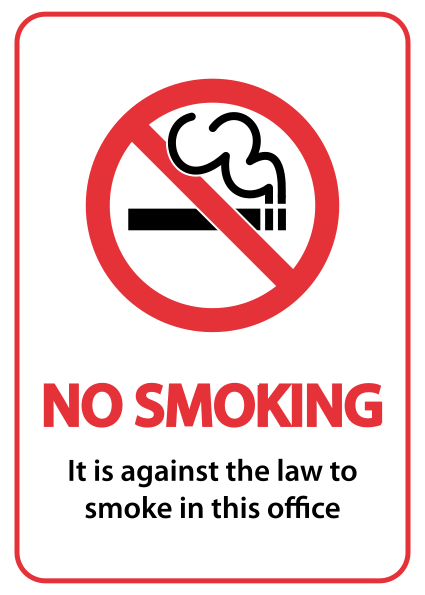 This features a red and white sign that reads "No Smoking" in bold letters. The sign is placed on top of an office desk, likely to inform visitors or employees about the smoking policy within the premises. The sign's message is clear and straightforward, indicating that smoking is not allowed inside the office space. This could be due to health concerns or a desire to maintain a clean and smoke-free environment for everyone in the workplace.