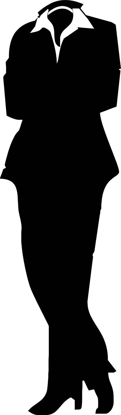 This features a silhouette of a woman dressed in a business suit. She is wearing a black outfit with a white collar, giving her an elegant and professional appearance. Her posture suggests that she might be standing or walking confidently, possibly on the street or at work. The overall impression created by this silhouette is one of sophistication and poise.