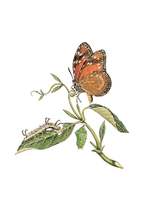This features a beautiful butterfly perched on the stem of a leaf. The butterfly is large and has an orange wing with black markings, making it stand out against the green background. The leaf itself appears to be a part of a flower, adding to the overall charm of the scene. This artistic representation captures the delicate beauty of nature, showcasing the intricate details of both the butterfly and the plant life.