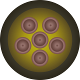 This features a round, yellow-colored surface with six small circles arranged in the center. Each of these circles is slightly larger than the others and has a brownish hue to them. They are positioned at various angles around the central point, creating an interesting visual effect. The overall composition gives off a sense of depth and intrigue, making it an engaging piece of art or design.
