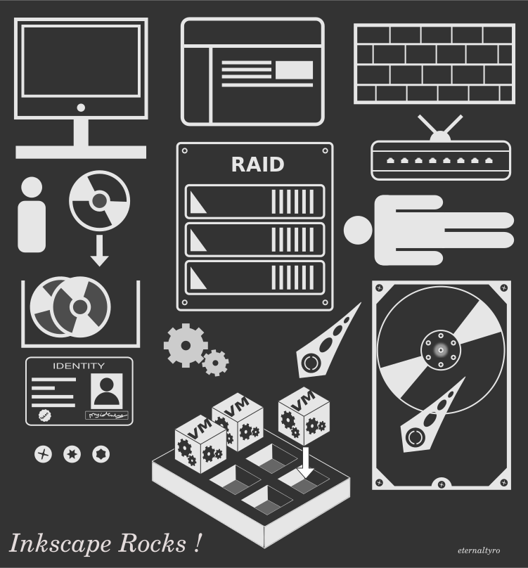 Tags: cds, dashboard, disk, gear, harddisk, hard disk, man, monitor, screw head, screws, storage, virtual machine, wall, inkscape rocks!