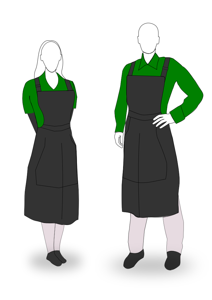 This features two people standing next to each other, both wearing green shirts and aprons. They appear to be posing for a picture or possibly waiting to serve customers in a restaurant setting. Their outfits are well-coordinated, with the aprons covering their waists and the shirts extending downwards. The two individuals seem to be of different heights, which adds variety to the scene. Overall, it is an interesting visual that captures the essence of a professional environment where uniformed staff members are ready for service.
