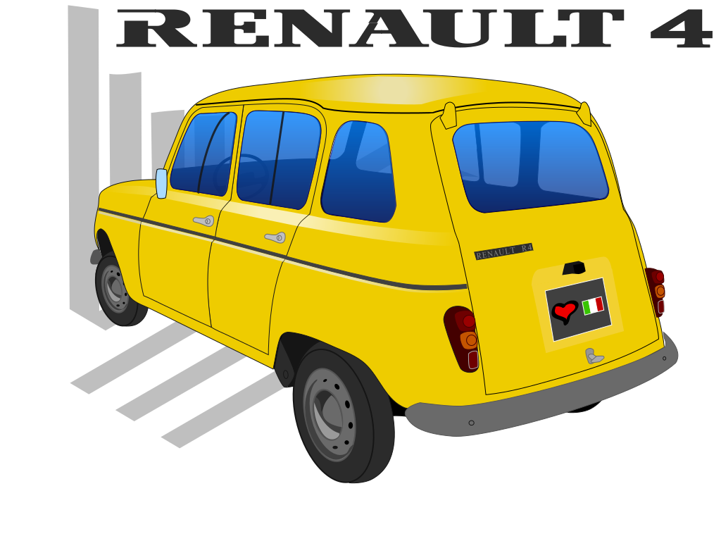 This features a yellow Renault 4 car parked in front of a building. This classic vehicle has three windows on the left and right sides, giving it a unique appearance. A license plate is visible at the back of the car, with an Italian flag and heart symbol adorning it. The overall scene gives off a vintage feel, reminiscent of older times when Renault 4 cars were popular.