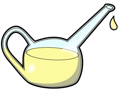 This features a cartoon-like illustration of an oil can, which is filled with yellow liquid. The can has a handle and spout, making it easy to pour the contents out. The yellow substance inside the can appears to be a type of oil or fat, as it fills the container almost entirely. This whimsical drawing captures the essence of an everyday object in a playful manner.