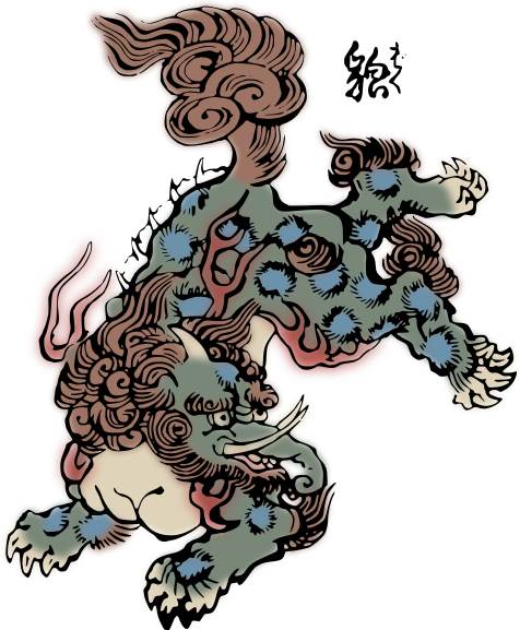 This features a unique and intricate design of an animal, possibly a dragon or a dog-like creature. It is depicted in various shades of blue and red, giving it a vibrant appearance. The animal's body is adorned with many decorative elements such as swirls and patterns, which add to its visual appeal. The design appears to be inspired by Asian artwork, possibly Japanese, given the use of bold colors and intricate details. Overall, this image showcases a captivating piece of art that combines both cultural influences and creativity.