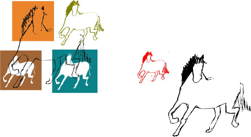 This features a series of drawings or paintings of horses, each in different colors and poses. There are five distinct horses visible in the scene, with one horse standing out from the rest as it is colored red. The other four horses are depicted in various shades of blue, green, orange, and yellow. Each horse appears to be captured at a different stage or moment, showcasing their unique features and poses. Overall, the image presents an artistic representation of these majestic creatures through a combination of colors and styles.