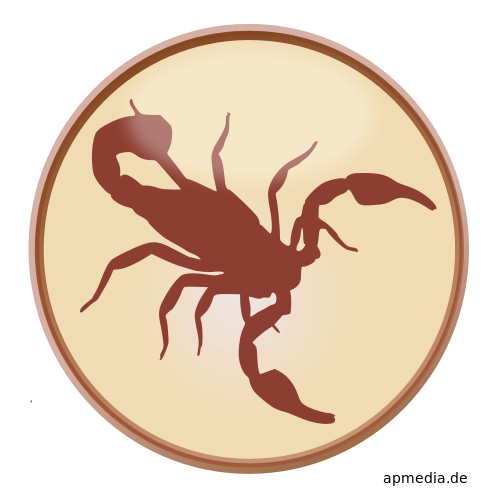 This features a brown scorpion with two pincers and a tail, prominently displayed on a light brown plate. The plate is round in shape and has a slightly darker brown border around the edges. The scorpion's body occupies most of the space within the circle, making it the focal point of the image.